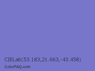 CIELab 53.183,21.663,-43.458 Color is a light indigo color and the nearest color is Moody Blue #7f76d3. Hex code #7876ca and RGB value is rgb(120,118,202). In RGB color space, this color is composed of 47% red, 46% green, 79% blue, In CMYK color space, this color is composed of 41% cyan, 42% magenta, 0% yellow , 21% black , In HSL color space, this color has a hue angle of 241° , 44% saturation and 63% lightness.