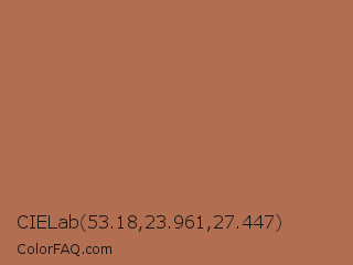 CIELab 53.18,23.961,27.447 Color is a normal orange color and the nearest color is Santa Fe #b16d52. Hex code #b26e51 and RGB value is rgb(178,110,81). In RGB color space, this color is composed of 70% red, 43% green, 32% blue, In CMYK color space, this color is composed of 0% cyan, 38% magenta, 54% yellow , 30% black , In HSL color space, this color has a hue angle of 18° , 39% saturation and 51% lightness.