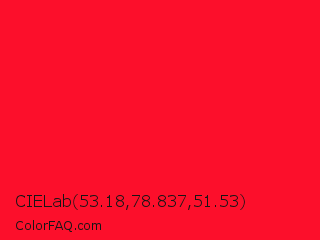CIELab 53.18,78.837,51.53 Color is a normal red color and the nearest color is Torch Red #fd0e35. Hex code #fc0f2b and RGB value is rgb(252,15,43). In RGB color space, this color is composed of 99% red, 6% green, 17% blue, In CMYK color space, this color is composed of 0% cyan, 94% magenta, 83% yellow , 1% black , In HSL color space, this color has a hue angle of 353° , 98% saturation and 52% lightness.