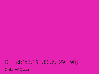 CIELab 53.191,80.6,-29.198 Color is a normal magenta color and the nearest color is Frostbite #e936a7. Hex code #e622b3 and RGB value is rgb(230,34,179). In RGB color space, this color is composed of 90% red, 13% green, 70% blue, In CMYK color space, this color is composed of 0% cyan, 85% magenta, 22% yellow , 10% black , In HSL color space, this color has a hue angle of 316° , 80% saturation and 52% lightness.