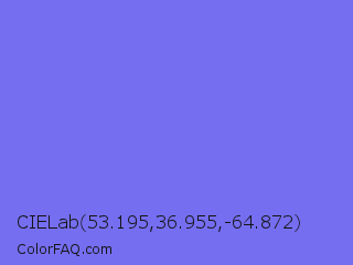 CIELab 53.195,36.955,-64.872 Color is a light indigo color and the nearest color is Medium Slate Blue #7b68ee. Hex code #756ef0 and RGB value is rgb(117,110,240). In RGB color space, this color is composed of 46% red, 43% green, 94% blue, In CMYK color space, this color is composed of 51% cyan, 54% magenta, 0% yellow , 6% black , In HSL color space, this color has a hue angle of 243° , 81% saturation and 69% lightness.