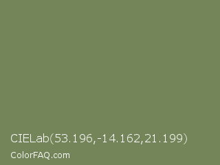 CIELab 53.196,-14.162,21.199 Color is a normal green color and the nearest color is Limed Ash #747d63. Hex code #74855a and RGB value is rgb(116,133,90). In RGB color space, this color is composed of 45% red, 52% green, 35% blue, In CMYK color space, this color is composed of 13% cyan, 0% magenta, 32% yellow , 48% black , In HSL color space, this color has a hue angle of 84° , 19% saturation and 44% lightness.