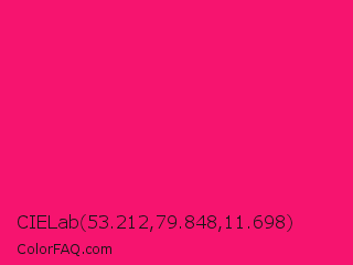 CIELab 53.212,79.848,11.698 Color is a normal rose color and the nearest color is Vivid Raspberry #ff006c. Hex code #f6146f and RGB value is rgb(246,20,111). In RGB color space, this color is composed of 96% red, 8% green, 44% blue, In CMYK color space, this color is composed of 0% cyan, 92% magenta, 55% yellow , 4% black , In HSL color space, this color has a hue angle of 336° , 93% saturation and 52% lightness.