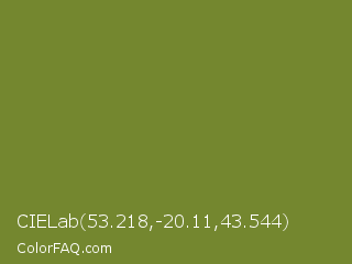 CIELab 53.218,-20.11,43.544 Color is a normal lime color and the nearest color is Wasabi #788a25. Hex code #74872f and RGB value is rgb(116,135,47). In RGB color space, this color is composed of 45% red, 53% green, 18% blue, In CMYK color space, this color is composed of 14% cyan, 0% magenta, 65% yellow , 47% black , In HSL color space, this color has a hue angle of 73° , 48% saturation and 36% lightness.