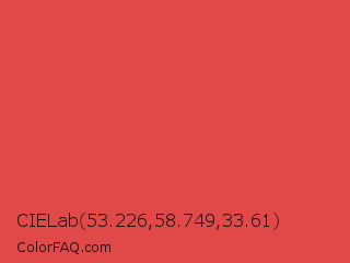 CIELab 53.226,58.749,33.61 Color is a normal red color and the nearest color is Carmine Pink #eb4c42. Hex code #e14949 and RGB value is rgb(225,73,73). In RGB color space, this color is composed of 88% red, 29% green, 29% blue, In CMYK color space, this color is composed of 0% cyan, 68% magenta, 68% yellow , 12% black , In HSL color space, this color has a hue angle of 0° , 72% saturation and 58% lightness.