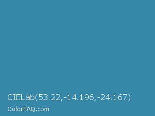 CIELab 53.22,-14.196,-24.167 Color is a normal blue color and the nearest color is Astral #327da0. Hex code #3788a8 and RGB value is rgb(55,136,168). In RGB color space, this color is composed of 22% red, 53% green, 66% blue, In CMYK color space, this color is composed of 67% cyan, 19% magenta, 0% yellow , 34% black , In HSL color space, this color has a hue angle of 197° , 51% saturation and 44% lightness.