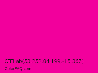 CIELab 53.252,84.199,-15.367 Color is a normal magenta color and the nearest color is Hollywood Cerise #f400a1. Hex code #f2009c and RGB value is rgb(242,0,156). In RGB color space, this color is composed of 95% red, 0% green, 61% blue, In CMYK color space, this color is composed of 0% cyan, 100% magenta, 36% yellow , 5% black , In HSL color space, this color has a hue angle of 321° , 100% saturation and 47% lightness.