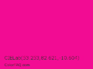 CIELab 53.253,82.621,-10.604 Color is a normal magenta color and the nearest color is Fluorescent Pink #ff1493. Hex code #f20c94 and RGB value is rgb(242,12,148). In RGB color space, this color is composed of 95% red, 5% green, 58% blue, In CMYK color space, this color is composed of 0% cyan, 95% magenta, 39% yellow , 5% black , In HSL color space, this color has a hue angle of 325° , 91% saturation and 50% lightness.