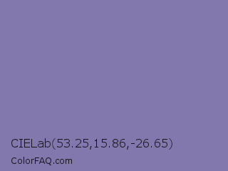 CIELab 53.25,15.86,-26.65 Color is a normal indigo color and the nearest color is Middle Blue Purple #8b72be. Hex code #8378ad and RGB value is rgb(131,120,173). In RGB color space, this color is composed of 51% red, 47% green, 68% blue, In CMYK color space, this color is composed of 24% cyan, 31% magenta, 0% yellow , 32% black , In HSL color space, this color has a hue angle of 252° , 24% saturation and 57% lightness.