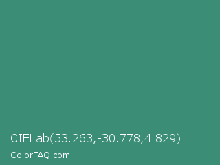 CIELab 53.263,-30.778,4.829 Color is a normal green color and the nearest color is Illuminating Emerald #319177. Hex code #3b8d76 and RGB value is rgb(59,141,118). In RGB color space, this color is composed of 23% red, 55% green, 46% blue, In CMYK color space, this color is composed of 58% cyan, 0% magenta, 16% yellow , 45% black , In HSL color space, this color has a hue angle of 163° , 41% saturation and 39% lightness.