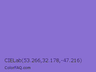 CIELab 53.266,32.178,-47.216 Color is a light indigo color and the nearest color is True V #8a73d6. Hex code #896fd1 and RGB value is rgb(137,111,209). In RGB color space, this color is composed of 54% red, 44% green, 82% blue, In CMYK color space, this color is composed of 34% cyan, 47% magenta, 0% yellow , 18% black , In HSL color space, this color has a hue angle of 256° , 52% saturation and 63% lightness.