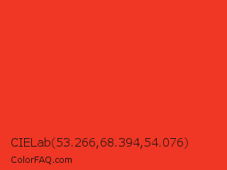 CIELab 53.266,68.394,54.076 Color is a normal red color and the nearest color is Pomegranate #f34723. Hex code #f03624 and RGB value is rgb(240,54,36). In RGB color space, this color is composed of 94% red, 21% green, 14% blue, In CMYK color space, this color is composed of 0% cyan, 78% magenta, 85% yellow , 6% black , In HSL color space, this color has a hue angle of 5° , 87% saturation and 54% lightness.