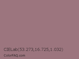 CIELab 53.273,16.725,1.032 Color is a normal red color and the nearest color is Bazaar #98777b. Hex code #9c757e and RGB value is rgb(156,117,126). In RGB color space, this color is composed of 61% red, 46% green, 49% blue, In CMYK color space, this color is composed of 0% cyan, 25% magenta, 19% yellow , 39% black , In HSL color space, this color has a hue angle of 346° , 16% saturation and 54% lightness.