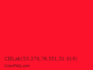 CIELab 53.279,78.551,51.619 Color is a normal red color and the nearest color is Torch Red #fd0e35. Hex code #fc122b and RGB value is rgb(252,18,43). In RGB color space, this color is composed of 99% red, 7% green, 17% blue, In CMYK color space, this color is composed of 0% cyan, 93% magenta, 83% yellow , 1% black , In HSL color space, this color has a hue angle of 354° , 98% saturation and 53% lightness.