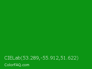 CIELab 53.289,-55.912,51.622 Color is a normal green color and the nearest color is India Green #138808. Hex code #0c9415 and RGB value is rgb(12,148,21). In RGB color space, this color is composed of 5% red, 58% green, 8% blue, In CMYK color space, this color is composed of 92% cyan, 0% magenta, 86% yellow , 42% black , In HSL color space, this color has a hue angle of 124° , 85% saturation and 31% lightness.