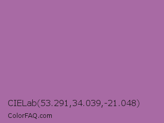 CIELab 53.291,34.039,-21.048 Color is a normal magenta color and the nearest color is Pearly Purple #b768a2. Hex code #a86aa4 and RGB value is rgb(168,106,164). In RGB color space, this color is composed of 66% red, 42% green, 64% blue, In CMYK color space, this color is composed of 0% cyan, 37% magenta, 2% yellow , 34% black , In HSL color space, this color has a hue angle of 304° , 26% saturation and 54% lightness.