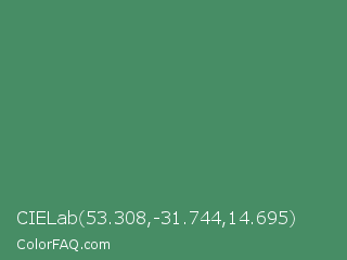 CIELab 53.308,-31.744,14.695 Color is a normal green color and the nearest color is Middle Green #4d8c57. Hex code #478d65 and RGB value is rgb(71,141,101). In RGB color space, this color is composed of 28% red, 55% green, 40% blue, In CMYK color space, this color is composed of 50% cyan, 0% magenta, 28% yellow , 45% black , In HSL color space, this color has a hue angle of 146° , 33% saturation and 42% lightness.