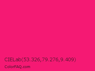 CIELab 53.326,79.276,9.409 Color is a normal rose color and the nearest color is Razzmatazz #e3256b. Hex code #f51973 and RGB value is rgb(245,25,115). In RGB color space, this color is composed of 96% red, 10% green, 45% blue, In CMYK color space, this color is composed of 0% cyan, 90% magenta, 53% yellow , 4% black , In HSL color space, this color has a hue angle of 335° , 92% saturation and 53% lightness.