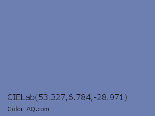 CIELab 53.327,6.784,-28.971 Color is a normal blue color and the nearest color is Glaucous #6082b6. Hex code #6d7eb1 and RGB value is rgb(109,126,177). In RGB color space, this color is composed of 43% red, 49% green, 69% blue, In CMYK color space, this color is composed of 38% cyan, 29% magenta, 0% yellow , 31% black , In HSL color space, this color has a hue angle of 225° , 30% saturation and 56% lightness.