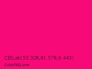CIELab 53.328,81.578,6.443 Color is a normal rose color and the nearest color is Winter Sky #ff007c. Hex code #f70a78 and RGB value is rgb(247,10,120). In RGB color space, this color is composed of 97% red, 4% green, 47% blue, In CMYK color space, this color is composed of 0% cyan, 96% magenta, 51% yellow , 3% black , In HSL color space, this color has a hue angle of 332° , 94% saturation and 50% lightness.