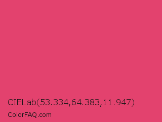 CIELab 53.334,64.383,11.947 Color is a normal rose color and the nearest color is Cabaret #d94972. Hex code #e3426e and RGB value is rgb(227,66,110). In RGB color space, this color is composed of 89% red, 26% green, 43% blue, In CMYK color space, this color is composed of 0% cyan, 71% magenta, 52% yellow , 11% black , In HSL color space, this color has a hue angle of 344° , 74% saturation and 57% lightness.