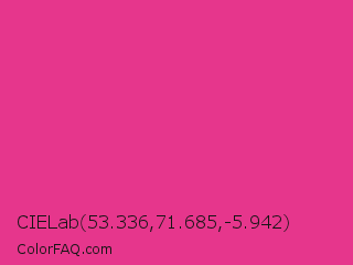 CIELab 53.336,71.685,-5.942 Color is a normal rose color and the nearest color is Cerise Pink #ec3b83. Hex code #e6368c and RGB value is rgb(230,54,140). In RGB color space, this color is composed of 90% red, 21% green, 55% blue, In CMYK color space, this color is composed of 0% cyan, 77% magenta, 39% yellow , 10% black , In HSL color space, this color has a hue angle of 331° , 78% saturation and 56% lightness.