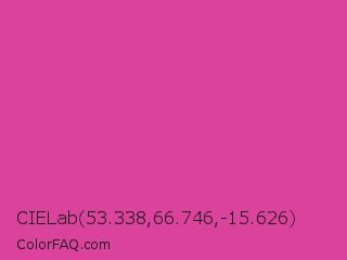 CIELab 53.338,66.746,-15.626 Color is a normal magenta color and the nearest color is Pink Pantone #d74894. Hex code #db429c and RGB value is rgb(219,66,156). In RGB color space, this color is composed of 86% red, 26% green, 61% blue, In CMYK color space, this color is composed of 0% cyan, 70% magenta, 29% yellow , 14% black , In HSL color space, this color has a hue angle of 325° , 68% saturation and 56% lightness.