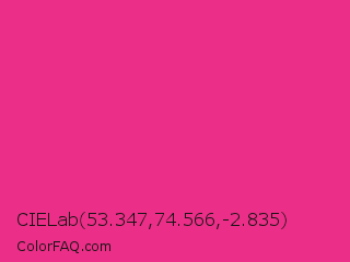 CIELab 53.347,74.566,-2.835 Color is a normal rose color and the nearest color is Cerise Pink #ec3b83. Hex code #eb2e87 and RGB value is rgb(235,46,135). In RGB color space, this color is composed of 92% red, 18% green, 53% blue, In CMYK color space, this color is composed of 0% cyan, 80% magenta, 43% yellow , 8% black , In HSL color space, this color has a hue angle of 332° , 83% saturation and 55% lightness.