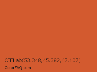 CIELab 53.348,45.382,47.107 Color is a normal orange color and the nearest color is Flame Pea #da5b38. Hex code #d35a2f and RGB value is rgb(211,90,47). In RGB color space, this color is composed of 83% red, 35% green, 18% blue, In CMYK color space, this color is composed of 0% cyan, 57% magenta, 78% yellow , 17% black , In HSL color space, this color has a hue angle of 16° , 65% saturation and 51% lightness.