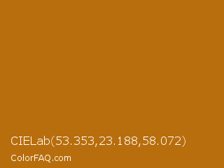 CIELab 53.353,23.188,58.072 Color is a normal orange color and the nearest color is Mai Tai #b06608. Hex code #b86e0d and RGB value is rgb(184,110,13). In RGB color space, this color is composed of 72% red, 43% green, 5% blue, In CMYK color space, this color is composed of 0% cyan, 40% magenta, 93% yellow , 28% black , In HSL color space, this color has a hue angle of 34° , 87% saturation and 39% lightness.