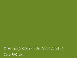 CIELab 53.357,-26.57,47.647 Color is a normal lime color and the nearest color is Olive Drab #6b8e23. Hex code #6a8a25 and RGB value is rgb(106,138,37). In RGB color space, this color is composed of 42% red, 54% green, 15% blue, In CMYK color space, this color is composed of 23% cyan, 0% magenta, 73% yellow , 46% black , In HSL color space, this color has a hue angle of 79° , 58% saturation and 34% lightness.