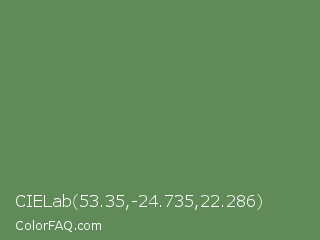 CIELab 53.35,-24.735,22.286 Color is a normal green color and the nearest color is Glade Green #61845f. Hex code #608a58 and RGB value is rgb(96,138,88). In RGB color space, this color is composed of 38% red, 54% green, 35% blue, In CMYK color space, this color is composed of 30% cyan, 0% magenta, 36% yellow , 46% black , In HSL color space, this color has a hue angle of 110° , 22% saturation and 44% lightness.