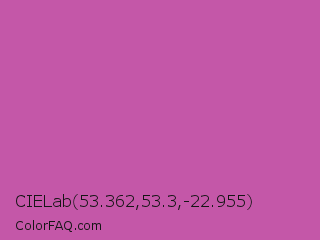 CIELab 53.362,53.3,-22.955 Color is a normal magenta color and the nearest color is Pearly Purple #b768a2. Hex code #c457a8 and RGB value is rgb(196,87,168). In RGB color space, this color is composed of 77% red, 34% green, 66% blue, In CMYK color space, this color is composed of 0% cyan, 56% magenta, 14% yellow , 23% black , In HSL color space, this color has a hue angle of 315° , 48% saturation and 55% lightness.