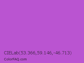 CIELab 53.366,59.146,-46.713 Color is a normal purple color and the nearest color is Medium Orchid #ba55d3. Hex code #ba54d1 and RGB value is rgb(186,84,209). In RGB color space, this color is composed of 73% red, 33% green, 82% blue, In CMYK color space, this color is composed of 11% cyan, 60% magenta, 0% yellow , 18% black , In HSL color space, this color has a hue angle of 289° , 58% saturation and 57% lightness.