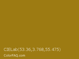 CIELab 53.36,3.768,55.475 Color is a normal orange color and the nearest color is Buttered Rum #a1750d. Hex code #9d7b12 and RGB value is rgb(157,123,18). In RGB color space, this color is composed of 62% red, 48% green, 7% blue, In CMYK color space, this color is composed of 0% cyan, 22% magenta, 89% yellow , 38% black , In HSL color space, this color has a hue angle of 45° , 79% saturation and 34% lightness.