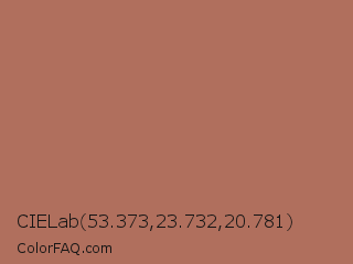 CIELab 53.373,23.732,20.781 Color is a normal red color and the nearest color is Santa Fe #b16d52. Hex code #b06f5d and RGB value is rgb(176,111,93). In RGB color space, this color is composed of 69% red, 44% green, 36% blue, In CMYK color space, this color is composed of 0% cyan, 37% magenta, 47% yellow , 31% black , In HSL color space, this color has a hue angle of 13° , 34% saturation and 53% lightness.
