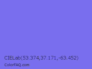 CIELab 53.374,37.171,-63.452 Color is a light indigo color and the nearest color is Medium Slate Blue #7b68ee. Hex code #796eee and RGB value is rgb(121,110,238). In RGB color space, this color is composed of 47% red, 43% green, 93% blue, In CMYK color space, this color is composed of 49% cyan, 54% magenta, 0% yellow , 7% black , In HSL color space, this color has a hue angle of 245° , 79% saturation and 68% lightness.