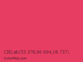 CIELab 53.378,66.694,18.737 Color is a normal red color and the nearest color is Paradise Pink #e63e62. Hex code #e83d63 and RGB value is rgb(232,61,99). In RGB color space, this color is composed of 91% red, 24% green, 39% blue, In CMYK color space, this color is composed of 0% cyan, 74% magenta, 57% yellow , 9% black , In HSL color space, this color has a hue angle of 347° , 79% saturation and 57% lightness.