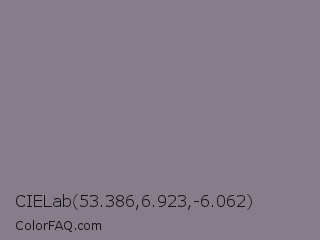 CIELab 53.386,6.923,-6.062 Color is a normal purple color and the nearest color is Monsoon #8a8389. Hex code #877c8a and RGB value is rgb(135,124,138). In RGB color space, this color is composed of 53% red, 49% green, 54% blue, In CMYK color space, this color is composed of 2% cyan, 10% magenta, 0% yellow , 46% black , In HSL color space, this color has a hue angle of 287° , 6% saturation and 51% lightness.