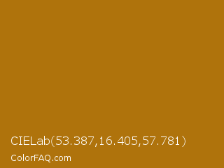 CIELab 53.387,16.405,57.781 Color is a normal orange color and the nearest color is Mai Tai #b06608. Hex code #af730c and RGB value is rgb(175,115,12). In RGB color space, this color is composed of 69% red, 45% green, 5% blue, In CMYK color space, this color is composed of 0% cyan, 34% magenta, 93% yellow , 31% black , In HSL color space, this color has a hue angle of 38° , 87% saturation and 37% lightness.