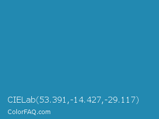 CIELab 53.391,-14.427,-29.117 Color is a normal blue color and the nearest color is Eastern Blue #1e9ab0. Hex code #2289b1 and RGB value is rgb(34,137,177). In RGB color space, this color is composed of 13% red, 54% green, 69% blue, In CMYK color space, this color is composed of 81% cyan, 23% magenta, 0% yellow , 31% black , In HSL color space, this color has a hue angle of 197° , 68% saturation and 41% lightness.