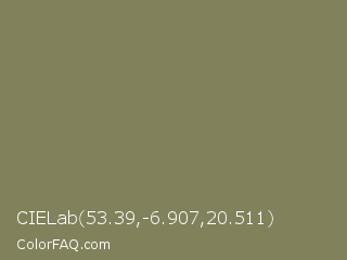 CIELab 53.39,-6.907,20.511 Color is a normal yellow color and the nearest color is Clay Creek #8a8360. Hex code #81825c and RGB value is rgb(129,130,92). In RGB color space, this color is composed of 51% red, 51% green, 36% blue, In CMYK color space, this color is composed of 1% cyan, 0% magenta, 29% yellow , 49% black , In HSL color space, this color has a hue angle of 62° , 17% saturation and 44% lightness.