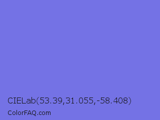 CIELab 53.39,31.055,-58.408 Color is a light indigo color and the nearest color is Medium Slate Blue #7b68ee. Hex code #7472e5 and RGB value is rgb(116,114,229). In RGB color space, this color is composed of 45% red, 45% green, 90% blue, In CMYK color space, this color is composed of 49% cyan, 50% magenta, 0% yellow , 10% black , In HSL color space, this color has a hue angle of 241° , 69% saturation and 67% lightness.