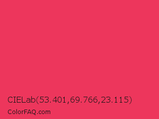 CIELab 53.401,69.766,23.115 Color is a normal red color and the nearest color is Desire #ea3c53. Hex code #ed365c and RGB value is rgb(237,54,92). In RGB color space, this color is composed of 93% red, 21% green, 36% blue, In CMYK color space, this color is composed of 0% cyan, 77% magenta, 61% yellow , 7% black , In HSL color space, this color has a hue angle of 348° , 84% saturation and 57% lightness.