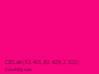 CIELab 53.401,82.429,2.322 Color is a normal rose color and the nearest color is Rose #ff007f. Hex code #f7057f and RGB value is rgb(247,5,127). In RGB color space, this color is composed of 97% red, 2% green, 50% blue, In CMYK color space, this color is composed of 0% cyan, 98% magenta, 49% yellow , 3% black , In HSL color space, this color has a hue angle of 330° , 96% saturation and 49% lightness.