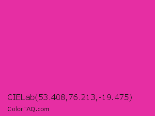CIELab 53.408,76.213,-19.475 Color is a normal magenta color and the nearest color is Frostbite #e936a7. Hex code #e62ea3 and RGB value is rgb(230,46,163). In RGB color space, this color is composed of 90% red, 18% green, 64% blue, In CMYK color space, this color is composed of 0% cyan, 80% magenta, 29% yellow , 10% black , In HSL color space, this color has a hue angle of 322° , 79% saturation and 54% lightness.