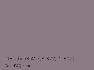 CIELab 53.457,8.372,-1.807 Color is a normal rose color and the nearest color is Rocket Metallic #8a7f80. Hex code #8d7b83 and RGB value is rgb(141,123,131). In RGB color space, this color is composed of 55% red, 48% green, 51% blue, In CMYK color space, this color is composed of 0% cyan, 13% magenta, 7% yellow , 45% black , In HSL color space, this color has a hue angle of 333° , 7% saturation and 52% lightness.