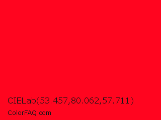 CIELab 53.457,80.062,57.711 Color is a normal red color and the nearest color is Ruddy #ff0028. Hex code #ff051f and RGB value is rgb(255,5,31). In RGB color space, this color is composed of 100% red, 2% green, 12% blue, In CMYK color space, this color is composed of 0% cyan, 98% magenta, 88% yellow , 0% black , In HSL color space, this color has a hue angle of 354° , 100% saturation and 51% lightness.