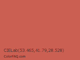 CIELab 53.465,41.79,28.528 Color is a normal red color and the nearest color is Cedar Chest #c95a49. Hex code #cb5f51 and RGB value is rgb(203,95,81). In RGB color space, this color is composed of 80% red, 37% green, 32% blue, In CMYK color space, this color is composed of 0% cyan, 53% magenta, 60% yellow , 20% black , In HSL color space, this color has a hue angle of 7° , 54% saturation and 56% lightness.
