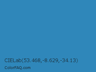 CIELab 53.468,-8.629,-34.13 Color is a normal blue color and the nearest color is Boston Blue #3b91b4. Hex code #2f87ba and RGB value is rgb(47,135,186). In RGB color space, this color is composed of 18% red, 53% green, 73% blue, In CMYK color space, this color is composed of 75% cyan, 27% magenta, 0% yellow , 27% black , In HSL color space, this color has a hue angle of 202° , 60% saturation and 46% lightness.